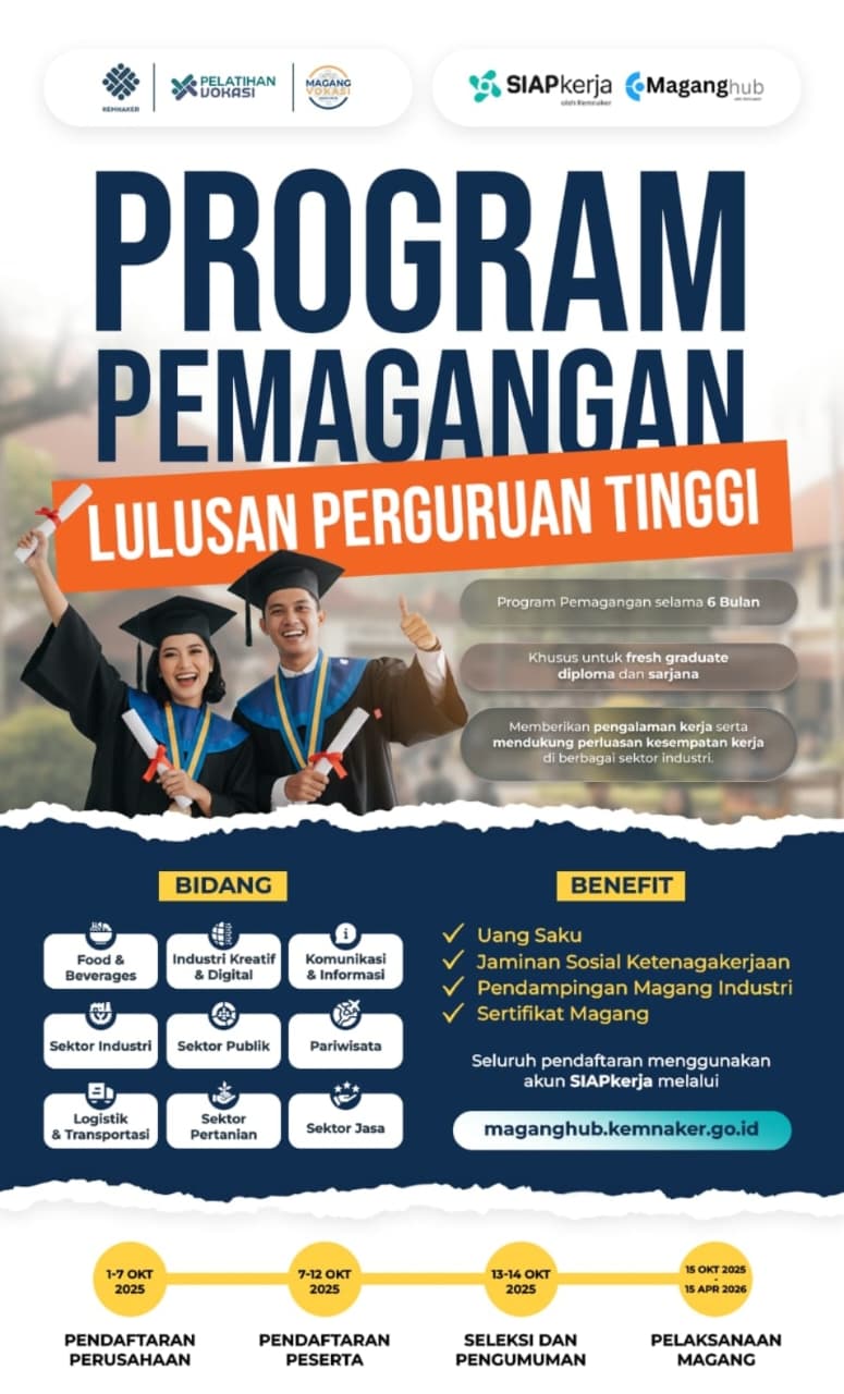MagangHubMagangHub adalah platform resmi dari Kementerian Ketenagakerjaan (Kemnaker) untuk program magang nasional bagi lulusan baru (fresh graduate) perguruan tinggi. Platform ini berfungsi sebagai jembatan antara penca ...